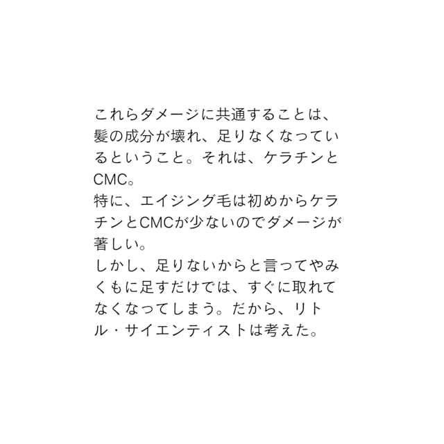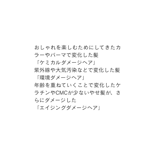 こんな方におススメ:カラーやパーマによる髪のダメージが大きい人 / 硬毛でやわらかい髪にしたい人 / エイジング毛で、さらにダメージした髪