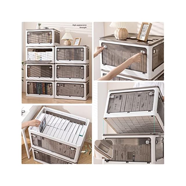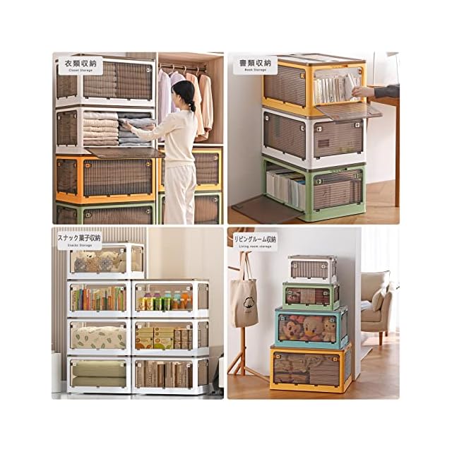 【折り畳み▪上に蓋/側面扉付き】収納箱界の大革新!使わない時に折りたたんで収納できます。スペースを取りません。側面四面も扉付き、収納にとても便利です。上にふた付き、物を入れやすい。蓋をロックできます。物を取るは側面扉から、ボックスを積み重ねる状態にも楽に物を取り出して、伝統的な収納ボックスに比べてもっと便利で、機能性が向上します。