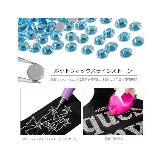 使用は簡単:ガラスラインストーンの裏面にホットメルト接着剤があらかじめ付けられています。フラットバックラインストーンを固定するには、家庭用アイロンまたはホットフィックスラインストーンアプリケーターをご使用ください。熱を加えずに接着剤を付けての使用も可能です。