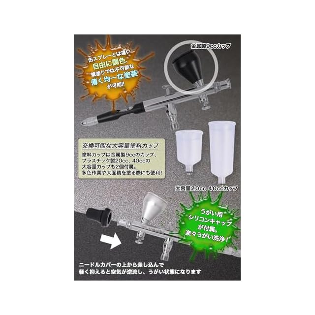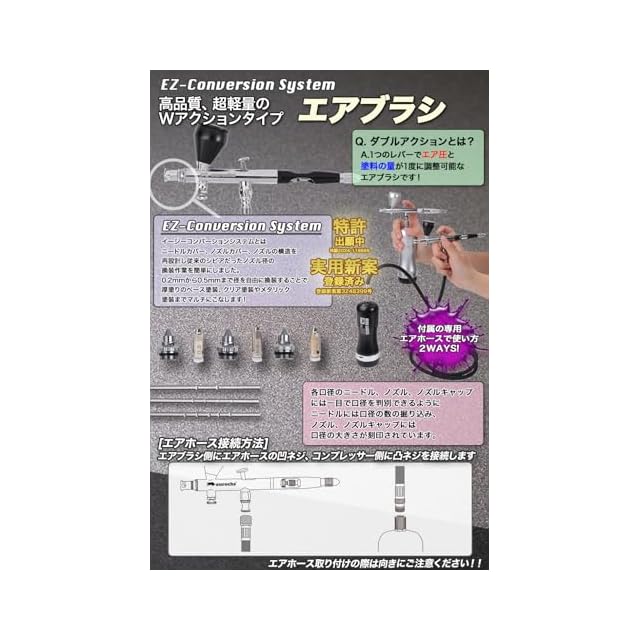 [こだわりの ダブルアクションタイプ、エアブラシがすごい!] 本格的なダブルアクションエアブラシ。 メインレバーひとつでエアー圧、塗料の量を調整でき厚塗りベース塗装からメタリック塗装までマルチにこなします! 塗料カップも9ccの金属製カップに加えプラスチック製の大容量カップも2個付属で大き面積を塗る際にも便利! お好みで付属の専用エアホースを接続することも可能。缶スプレーとは違い自由に調色、 筆塗りでは不可能な薄く均一な塗装が可能! 塗料もアクリル、エナメル、ラッカーなど多種対応! [エアブラシ ] 口径:EZ-Conversion System(0.2mm~0.5mm対応) カップ容量:金属製カップ 9cc、プラカップ20cc、40cc カップタイプ:重力式カップ 動作方法:ダブルアクション