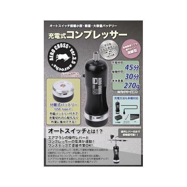プロ完全監修のハンディーエアブラシ セットの入門機! aurochs (オーロックス)ハンディーコンプレッサー&エアブラシ セットはテーマパークや映画、TV等の美術特殊塗装を手がける現役アートペインターの責任監修。実際に使う人が考えたアイディアが詰まっています! 革命的機構搭載!! オートスイッチ機能は物理スイッチから圧感知型にバージョンアップ!!エアブラシの操作レバーとコンプレッサーの電源が連動、塗装時のみ電源が自動起動。 軽く堅牢なアルミボディでさらに軽く、内部構造を改良し壊れにくい設計に、 正統進化を遂げた充電式コンプレッサーが多彩な塗装を実現するEZ-Conversion System対応のダブルアクションタイプエアブラシを搭載! さらに洗練された圧倒的パフォーマンスを体感してください!!