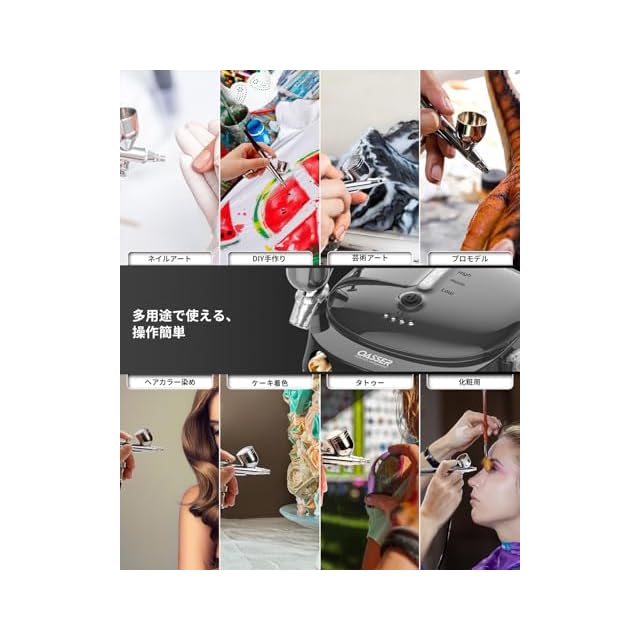 初心者向や多用途:日本語説明書がついています。初めてエアブラシに挑戦する初心者の方に最適です。エアブラシとエアコンプレッサーの組み合わ、これワンセットで塗装工事を始まりましょう。プラモデル、ネイルアート、芸術アート、DIY手描き、化粧用、タトゥー、カー装飾、迷彩塗装などいろんな分野で活躍できます。ミニサイズで、持ち運びやすいです。