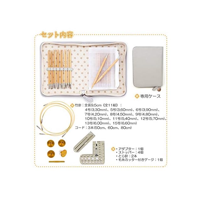 セット内容: 竹針11組 4号(3.30mm)、5号(3.60mm)、6号(3.90mm)、 7号(4.20mm)、8号(4.50mm)、9号(4.80mm)、 10号(5.10mm)、11号(5.40mm)、12号(5.70mm)、 13号(6.00mm)、15号(6.60mm)、コード3本(50cm、60cm、80cm)、アダプター1個、ストッパー4個、とじ針2本、毛糸カッター付きゲージ、ケース