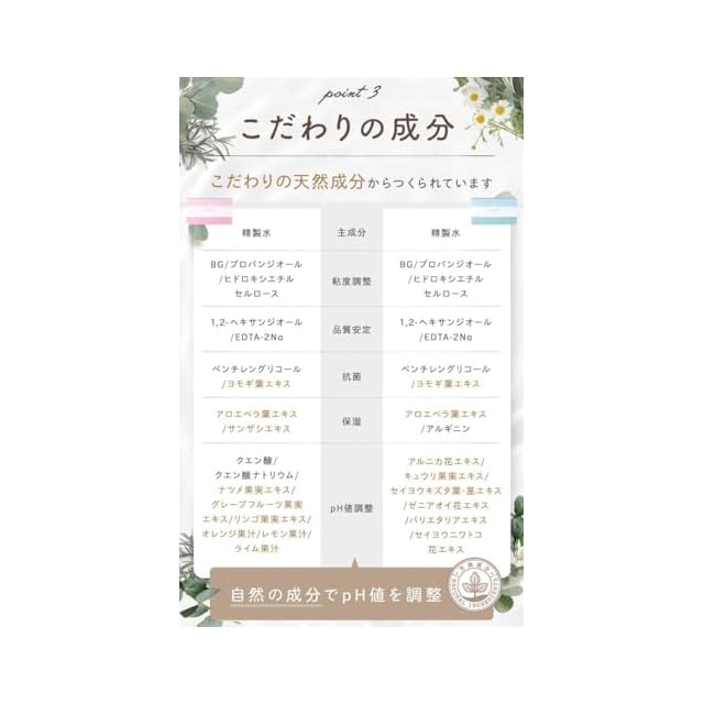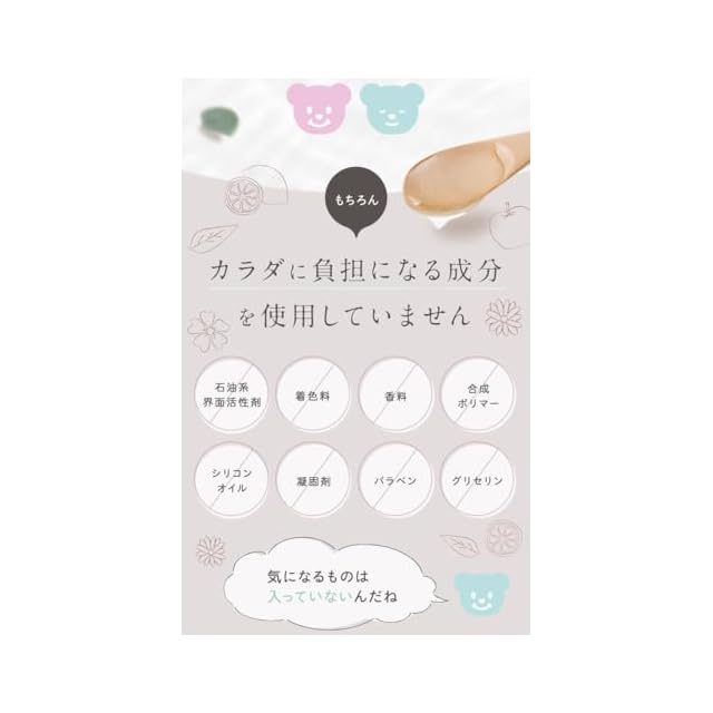 「石油系界面活性剤、着色料、香料、合成ポリマー、シリコンオイル、凝固剤、パラベン、グリセリン」の全フリー化を実現。カラダに負担になる成分は使用していないことも喜ばれている理由のひとつです。