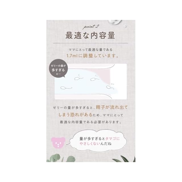 ゼリーの内容量はママにとって最適な量である1.7mlに調整。ゼリーの量は多すぎても少なすぎても最適な結果が得られないという信念のもと、日本人女性に最適な量を追求しました。