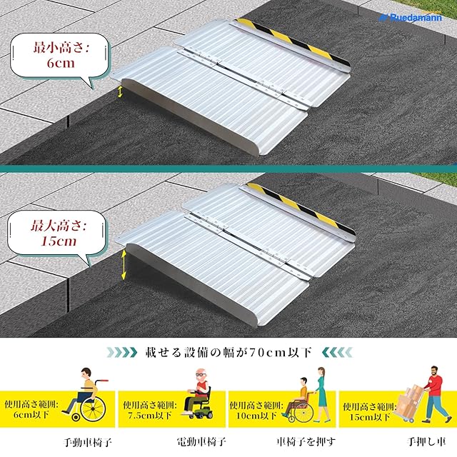 多用途:住宅の玄関、階段、倉庫や駐車場などさまざまな場所での段差解消に適しています。手動・電動車椅子はもちろん、歩行器、スクーター、小型カートにも対応します。日常的な介護用途に加え、台車を使った荷物運搬にも便利です。※バイク・三輪車には対応していません。