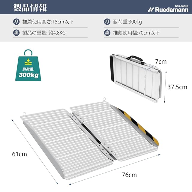 【サイズ】車椅子スロープの展開サイズ:長さ91cm*幅76cm*高さ5cm、折り畳みサイズ:長さ91cm*幅37cm*高さ7cm。使用高さ範囲9-22.5cm、推薦使用高さ15cm、お勧めの利用幅は70cmです。本品の衝撃耐荷重は300KGで、最大耐荷重は400KGです。