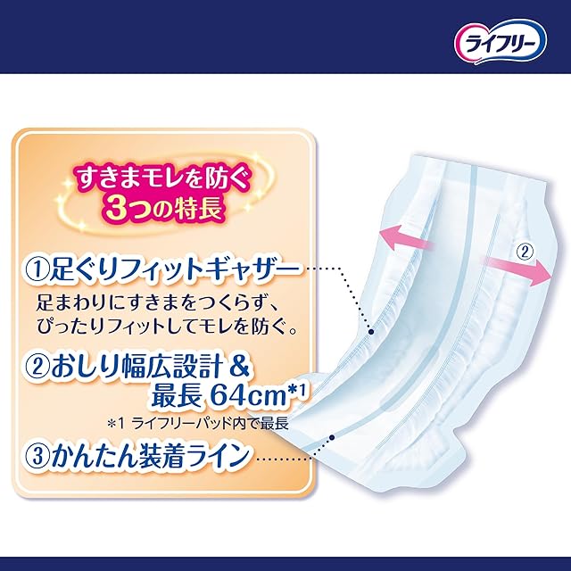 おしりをすっぽり包み込んでスキマをつくらない、幅広形状がしっかりガードし寝返りモレと後ろモレを防ぎます。