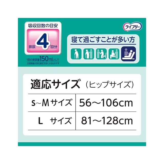 S〜Mサイズ ヒップサイズ56〜106cm 吸収回数の目安※排尿4回分 ※1回の排尿量150mlとして(当社測定方法によるものです)