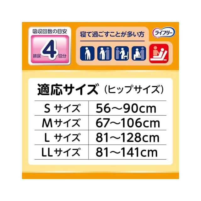 Sサイズ ヒップサイズ56〜90cm 吸収回数の目安※排尿4回分 ※1回の排尿量150mlとして(当社測定方法によるものです)