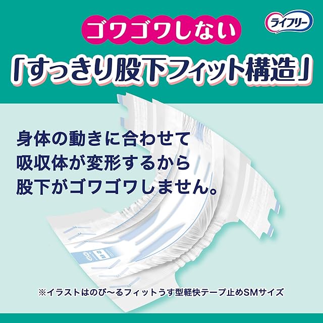 「すっきり股下フィット構造」が身体の動きに合わせて吸収体が変形するから、股下のゴワゴワを防ぎます。