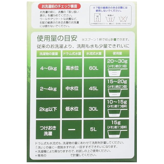 使用方法:45Lの水(洗濯物量約3kg分、ドラム式の場合約4.5kg分相当)に対し、約15g(従来の粉末洗濯洗剤の半分以下の使用量)を入れて洗濯します。1回すすぎで使えます。柔軟剤は不要ですが、この洗剤は無香料のため、香りがほしい方は柔軟剤の規定使用量の半分量でご使用ください。
