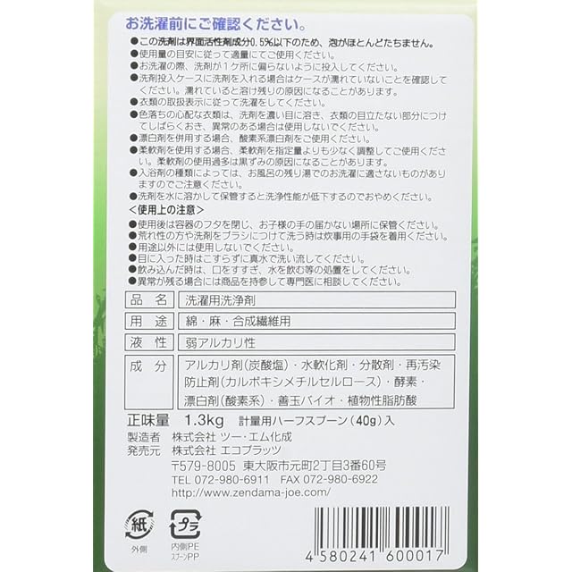 ご注意:この洗剤は界面活性剤が0.5%以下のため、泡がほとんどたちません。洗浄はしっかりと出来ています。また成分が弱アルカリ性のためウールやデリケートな衣類のお洗濯には使わないでください。