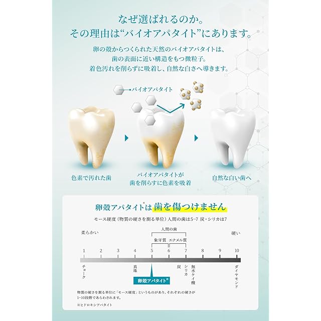 【研磨剤ゼロで、自然な白さへ】卵殻由来のバイオアパタイトを25%高配合。一般的な歯磨き粉のホワイトニング成分と比べて約11倍のサポート力で、歯を削らずにステインを吸着&コーティング。毎日のケアで歯本来の白さへ。