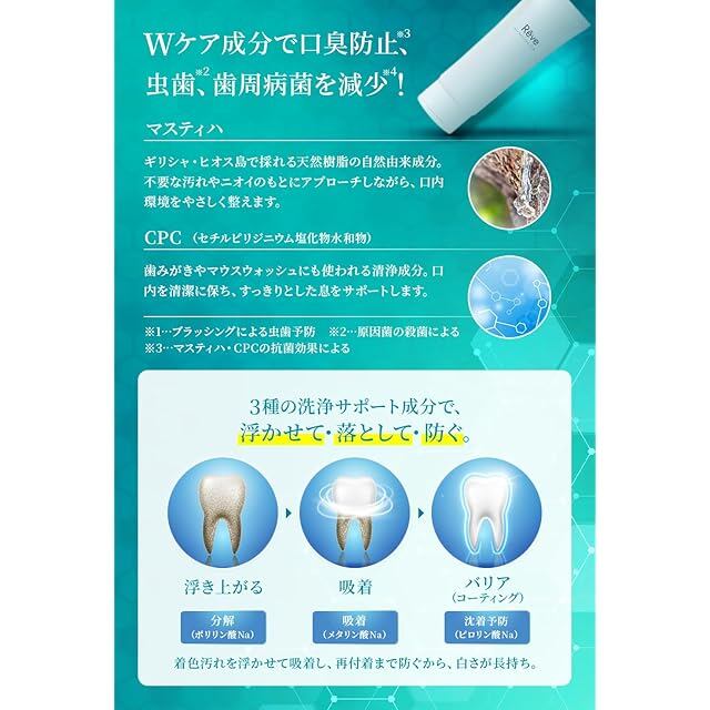 【トリプル洗浄×ダブル抗菌成分】ポリリン酸Na・メタリン酸Na・ピロリン酸Naが着色汚れを浮かせて除去し、マスティハ&CPC※が口内を清潔に保ちます。 ※保湿・清涼成分