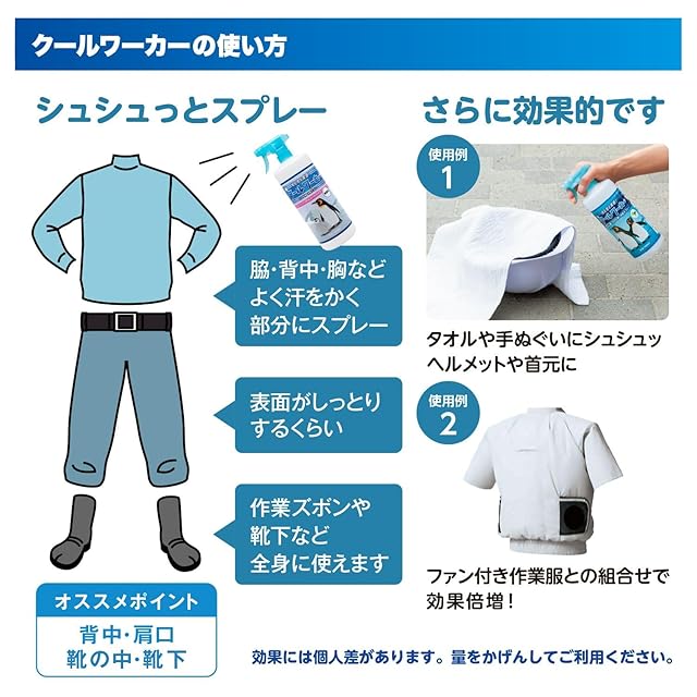 使い方は簡単!シャツ・靴下・帽子・ヘルメットなど、衣類にスプレーするだけで冷感効果を実感できます。