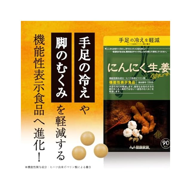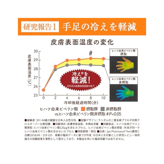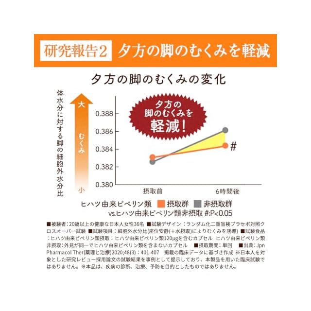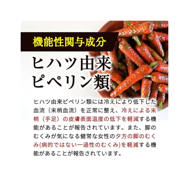 【手足の冷えと脚のむくみを軽減】本品にはヒハツ由来ピペリン類が含まれます。ヒハツ由来ピペリン類には冷えにより低下した血流(末梢血流)を正常に整え、冷えによる末梢(手足)の皮膚表面温度の低下を軽減する機能があることが報告されています。また、脚のむくみが気になる健常な女性の夕方の脚のむくみ(病的ではない一過性のむくみ)を軽減する機能があることが報告されています。