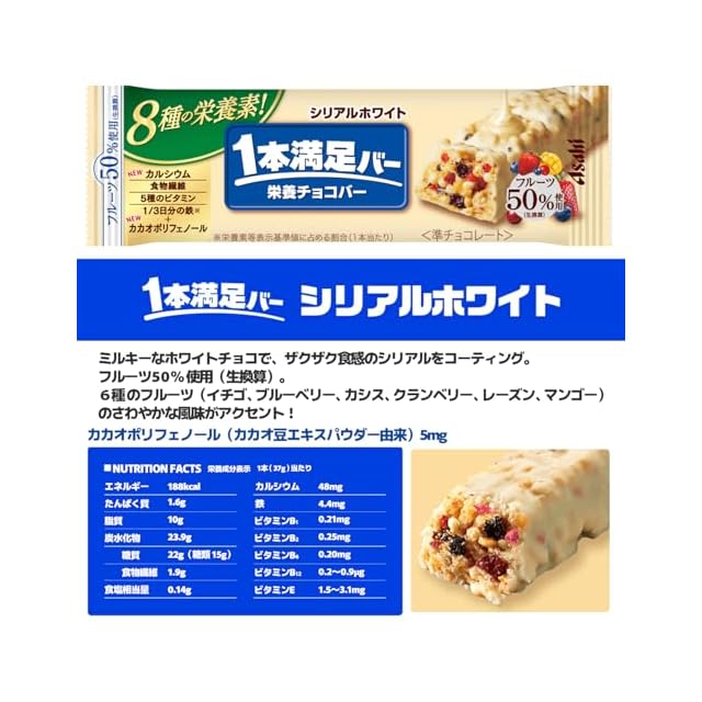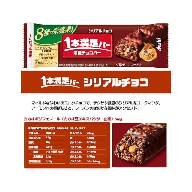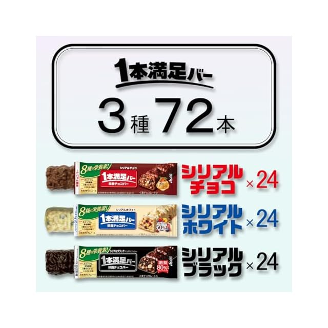 手軽に栄養補給ができ、おいしさと食べごたえのダブルの満足感が楽しめる、シリアルタイプのチョコレートバーです。<br><br> 「シリアルチョコ」 <br> マイルドな味わいのミルクチョコレートで、ザクっと食感のシリアルをコーティング。<br> 厳選カカオとミルク使用。<br> アーモンドの香ばしさと、レーズンのほのかな酸味がアクセント!<br><br> 「シリアルホワイト」 <br> ミルキーなホワイトチョコレートで、ザクっと食感のシリアルをコーティング。<br> フルーツ50%使用(生換算)。<br> 6種のフルーツ(イチゴ、ブルーベリー、カシス、クランベリー、レーズン、マンゴー)のさわやかな風味がアクセント!<br><br> 「シリアルブラック」 <br> ほろ苦い甘さ控えめのブラックチョコレートで、ザクっと食感のシリアルをコーティング。<br> 大きめにカットしたマカダミアナッツの香ばしさと食感がアクセント!<br><br> 【セット内容】<br> ・1本満足バー シリアルチョコ 37g × 24本<br> ・1本満足バー シリアルホワイト 37g × 24本<br> ・1本満足バー シリアルブラック 37g × 24本<br> 計72本