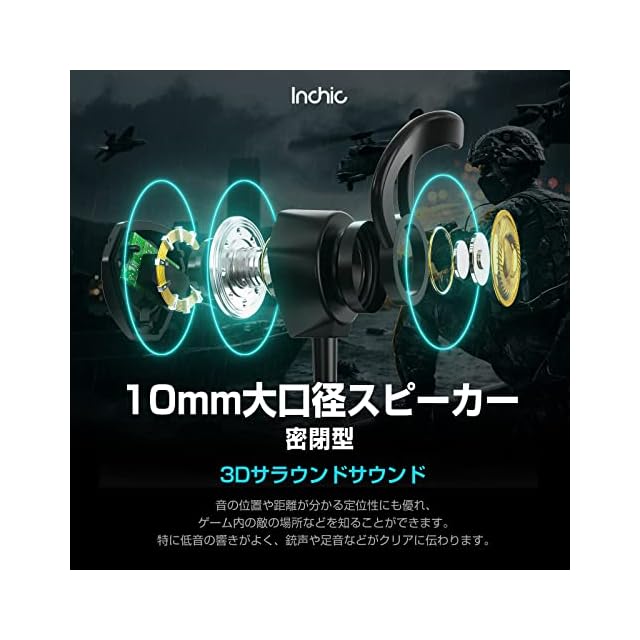 「ゲームに集中できるゲーミングイヤホン」inchicのゲーミングイヤホンは遮音性の高いカナル型を採用しており、周囲の音を気にせずにプレイに集中できます。普通のイヤホンと違い、10mmのドライバーを搭載しているため、音を細部まで聞き取りやすいです。音の位置や距離が分かる定位性にも優れ、ゲーム内の敵の場所などを知ることができます。特に低音の響きがよく、銃声や足音などがクリアに伝わります。