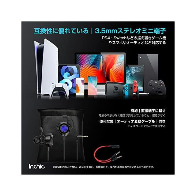 「ゲームでは遅延の少ない3.5mm|有線イヤホン」inchicのゲーミングいやほんは3.5mmステレオミニ端子でほぼすべてのオーディオ、モバイル、ゲーム機、PC機器等で使用いただけます。「PS4・PS5・PC・Macbook、Switch、XBOX ONE、スマートフォン、タブレットな」直接端子に繋ぐため、接続の安定性に優れています。便利な袋付きで、紛失やバッグの中での断線も防げます。ゲーム機などにも繋ぎやすいので、子供用や自宅用として購入するのもおすすめ。※XBOX ONEゲーム機にご利用頂く場合は変換アダプターが必要になります。