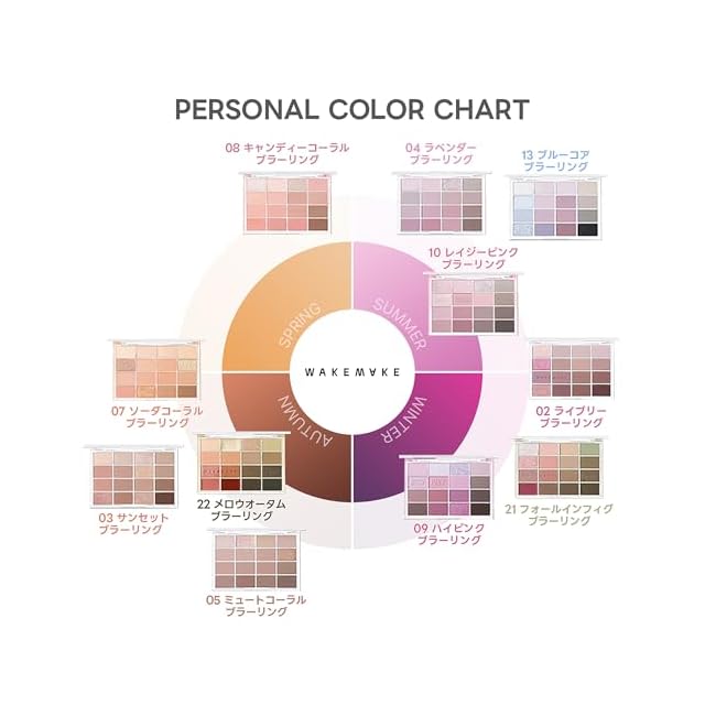 【トーン別に選べる6種のカラーバリエーション】スプリング・サマー・オータム・ウィンター別に肌トーンにマッチした配色で、浮かずに自然な仕上がりに。デイリー使いにもぴったりなアイシャドウパレット。
