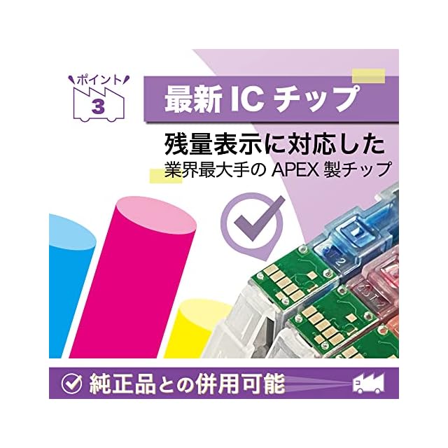 【本製品の特長】業界最大手のICチップ、日本製活性剤採用で目詰まりの原因を軽減したインク。顔料インクは文字を「くっきり」と、染料インクは写真紙になじみがよく高発色です。保存にも適している個包装でのお届けです。※本製品は純正品ではありません。純正品同様にご利用いただける互換インクカートリッジです。