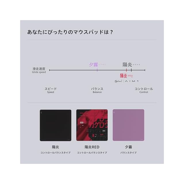 これまでにない操作体験を、夕霧で。500x500mmの広大なキャンバスに、バランスタイプの滑走性能をプラス。手元の紫が、操作のすべてを美しく支えます。これが、バランスを再定義する一枚です。