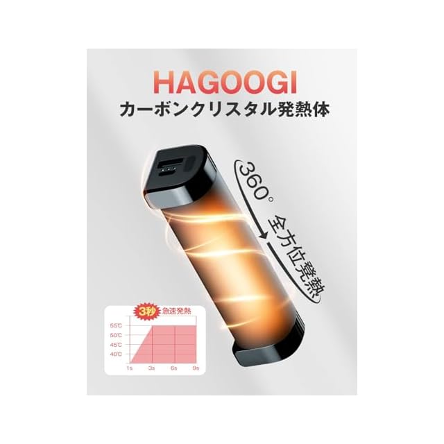 【3秒急速全方位発熱】HAGOOGI充電式カイロは、カーボンクリスタル発熱体を搭載しているので、わずか3秒で発熱を開始します!真ん中が発熱しない従来製品とは異なり、HAGOOGI電気カイロは360°全方位発熱可能の円筒形を採用して、より効率的に、全面的に寒さを凌ぐことができます。