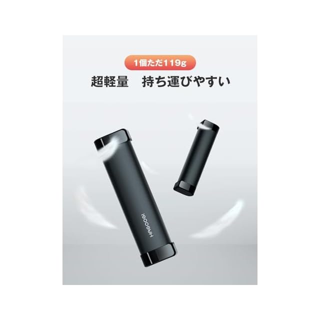 【小型軽量な充電式カイロ】1個の重量はわずか119gで、女性やお子様でもストレスなく握りやすいデザインになっています。二個並べる場合の本体サイズは29 x 58 x 112mm(幅 x 長さ x 高さ)で、持ち運びやすいです。