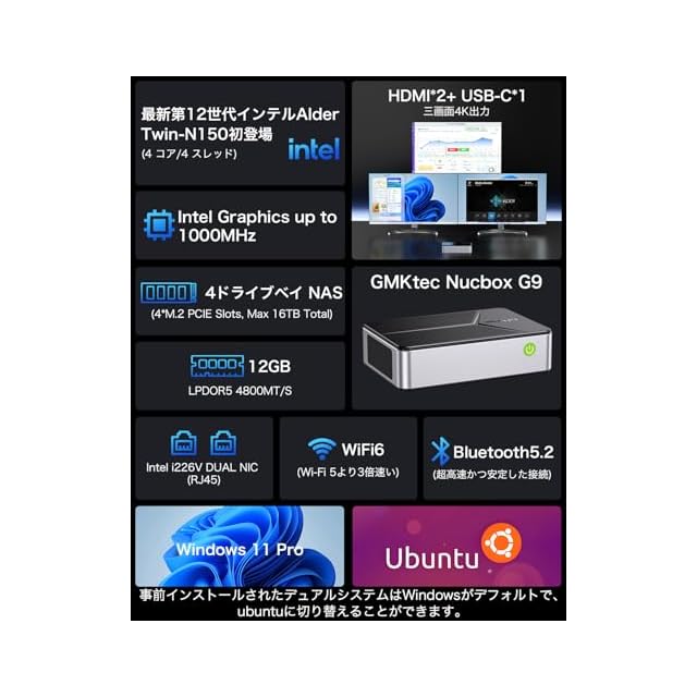GMKtec 【4ベイNAS ミニPC 初登場 】インテルTwin Lake-N150 最大3.6GHz LPDDR5 12GB SSD 1TB 4K三画面対応 WIFI6 & デュアル 2.5G LAN 静音冷却設計 デュアルOS対応(Windows 11 Pro & Ubuntu) (Intel 150 12GB+64GB+1TB)-new model