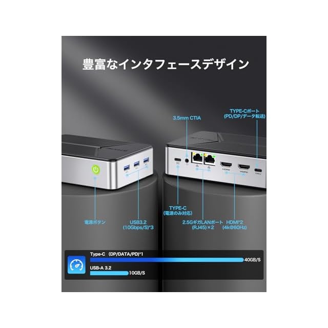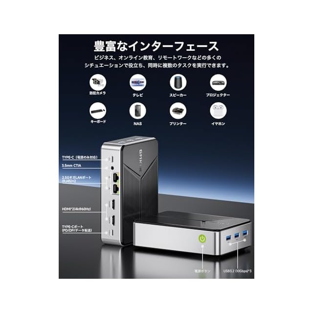 【 超高速USB 3.2ポート×3、最大10Gbpsで迅速なデータ転送】 GMKtec NucBox G9は、USB 3.2(Gen 2)ポート×3を搭載し、最大10Gbpsのデータ転送を実現。これにより、外付けSSDやハードドライブとのデータやファイル転送が迅速に行えます。例えば、大容量データをバックアップする際も、高速で転送でき、時間を大幅に節約できます。