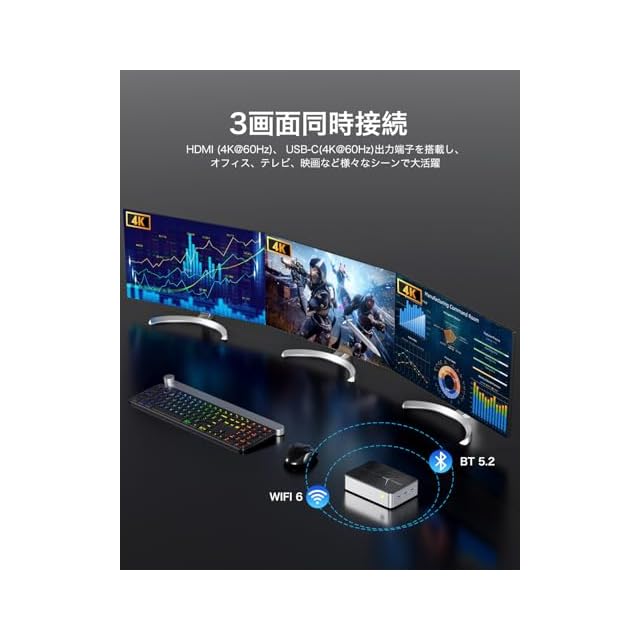 【最大3画面同時出力、4K解像度対応で作業効率を最大化】 GMKtec NucBox G9は、最大3画面同時出力をサポート。2つのHDMIポートとUSB-Cポート(DP対応)により、最大4096×2160@60Hzの4K解像度での表示が可能です。これにより、多画面マルチタスクが一度にでき、作業効率が向上します。例えば、デザインや編集作業で複数のツールを同時に開き、スムーズに作業できます。