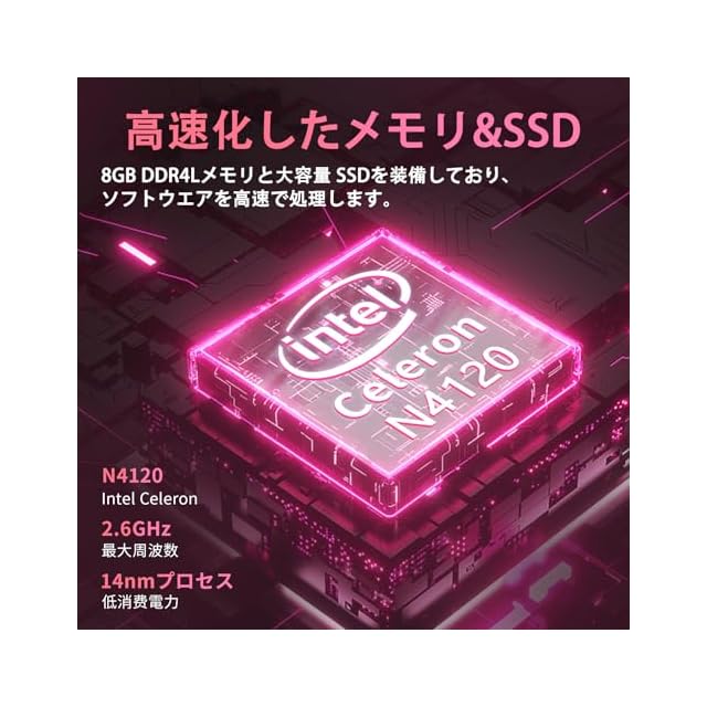 【高性能】8GBのメモリ 高速CPU インテルCeleron(R) J4125、標準周波数は2.0GHz~最高2.7GHz。インテル第9世代 J4125高速プロセッサーを搭載し、優れた応答性と静かなパフォーマンスの両方を実現します。テレワーク・事務処理・ネット閲覧・動画編集・オフィスソフト・オンラインラーニングなどの様々な用途でご使用いただけます。内蔵 webcamで、zoomビデオ会議やリモートワークにも最適です。