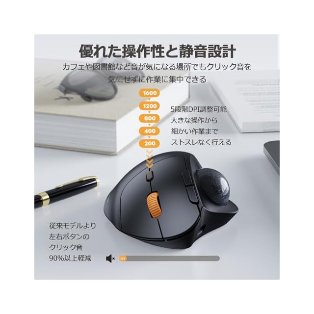 【静かなクリック】このトラックボールはカチカチ音がしない静音スイッチを採用しているため、前モデルより90%以上の操作音を軽減し、オフィスやカフェ、図書館など静かな場所でもクリック音を気にせずに勉強や仕事に集中できます。(※注意: DPI変更ボタン・進む・戻るボタンは静音仕様ではありません)【優れた操球感】光沢仕上げのボールとワイドなボール面は円滑な動きとソフトな感触を提供します。さらに、高密度粒子コーティングが施されており、正確で滑らかなトラッキングを実現しています。これ一台で、想像以上の操球感を楽しめます!