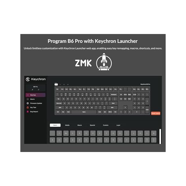 Keychron B6 Proは、シザースイッチを採用し、軽量、超薄型、フルサイズのワイヤレスキーボードで、1,200時間の長時間駆動を実現。2.4GHzワイヤレス、Bluetooth、有線モードに対応し、スマートフォン、タブレット、PC、Macに簡単に接続できます。ZMKのカスタマイズ機能により、自宅、オフィス、旅行など、用途に合わせた設定が可能です。