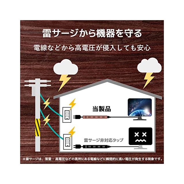 サージ電圧12500Vの高性能雷サージ吸収素子(バリスタ)を内蔵していますので、雷によるパソコンやAV機器などの電子機器への被害防止に有効です。※サージ電圧12500VはJEC210/212規格に基づく数値です。