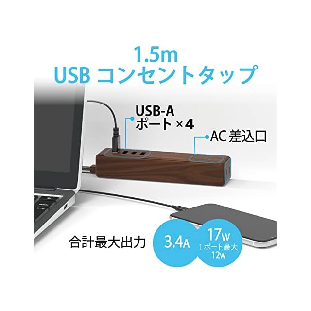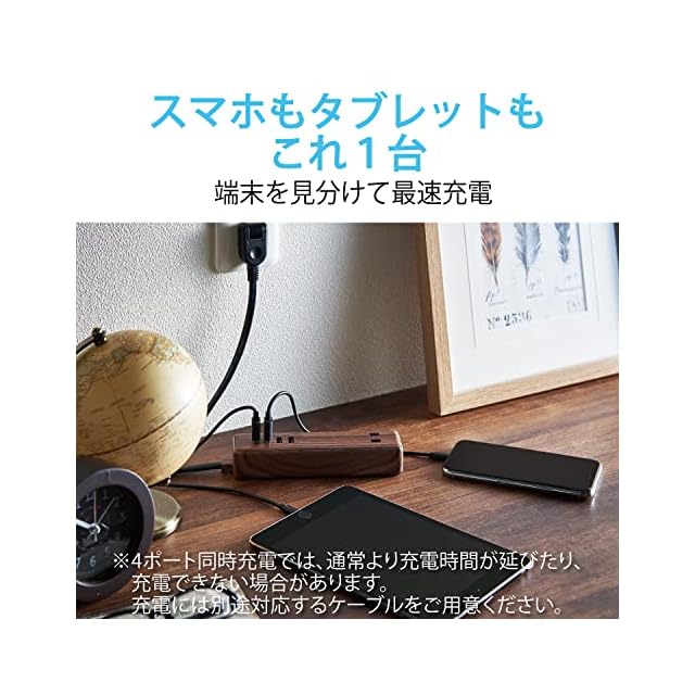 4つのUSBポートは合計3.4A出力で、対応する機器であれば4台同時充電が可能です。