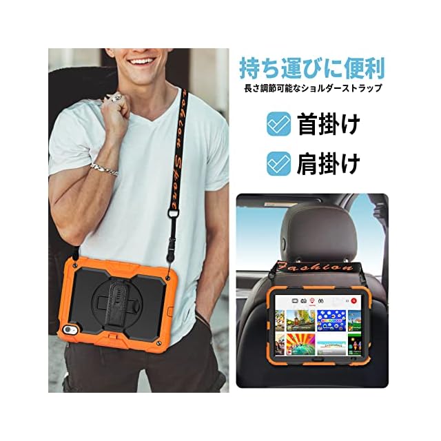 「ハンド&ショルダーストラップ」:回転盤に付いたハンドバンドは調整が可能で、手に持ってiPad 10世代を固定して楽しむことができます。また、最長49インチの可調整のショルダーストラップも備えており、ケースに接続することで、肩や首にかけることもできます。ビジネス、アウトドア、学校、工事、現場など、様々なシーンで大活躍!