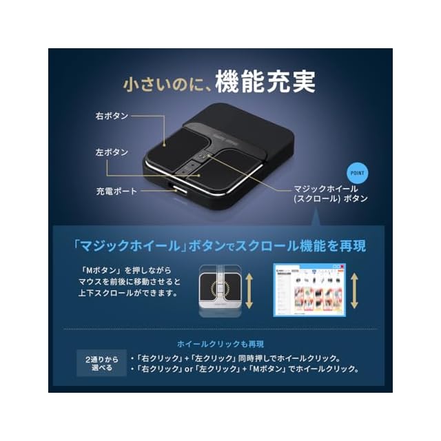 マジックホイールボタン(以下Mボタン)でスクロール機能を再現しています。 ホイール クリック にも対応します。 1.動かしたい方向(上下)へマウスを少しだけ移動させてMボタンを押すと、押している間スクロールします。 2.Mボタンを押しながらマウスを動かす(上下)とその方向にスクロールします。※左クリック+右クリック+Mボタンを2秒間長押しすることで、Mボタンでのスクロール速度が3段階切り替えられます。