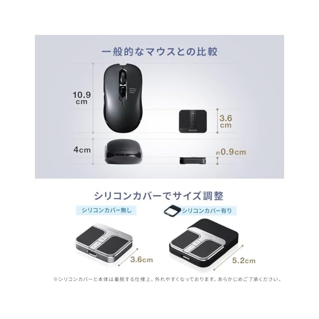 付属のシリコンカバーでサイズを調整することができます。シリコンカバーには USB A レシーバー を収納できます。左右クリック、スクロール(マジックホイール) ボタン を搭載した標準の 3ボタン 仕様です。