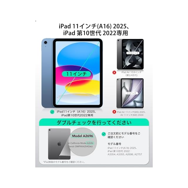 【互換性】:iPad 11インチ (A16) 2025、iPad 第10世代 2022専用です。モデル番号:A3354、A3355、A2696、A2757。ご注意:iPad Air 11インチと他のiPadモデルには非対応です。互換性を確認するには、iPadの背面下部にあるモデル番号「AXXXX」を確認してください。