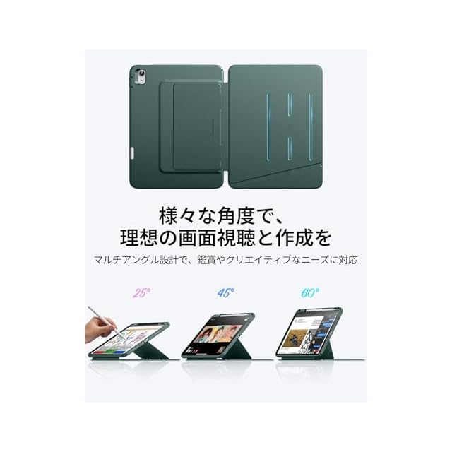 【マルチアングルデザイン】:2つのスタンドモードに対応しており、45°~60°はビデオ鑑賞、作業、FaceTimingなどに最適なビューイングモードへと、25°に調節した場合は執筆、絵画、その他のクリエイティブな作業に最適なライティングモードへと用途に合わせて角度調節が行えます。
