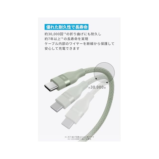 優れた耐久性で長寿命:約30,000回の折り曲げにも耐久し、約7年以上の長寿命を実現。ケーブル内部のワイヤーを断線から保護し、安心して充電できます (折り曲げ回数はAnker調べ。1日10回折り曲げる場合) 。