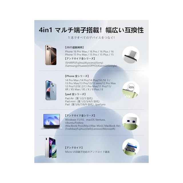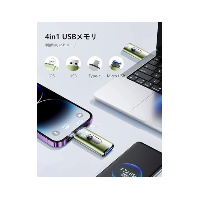 【4in1 ポート搭載|ios/Type-C/USB/Micro USB 対応の互換性抜群 USB メモリ】 ios端子・Type-C・USB-A・Micro USB の 4 つのポートを搭載し、Phone/Android/PC/Mac/pad などあらゆるデバイスと直接接続可能。1 つの USB メモリで iOS/Android/Windows/Mac OS 間でデータを共有・移行!詳細対応機種:Phone 全世代(16/15/14/13/12/11/X/8/7 シリーズ含む)、pad Pro/Air/mini/ ベーシックモデル、MacBook(Pro/Air)、Type-C スマホ / タブレットなど多数対応。