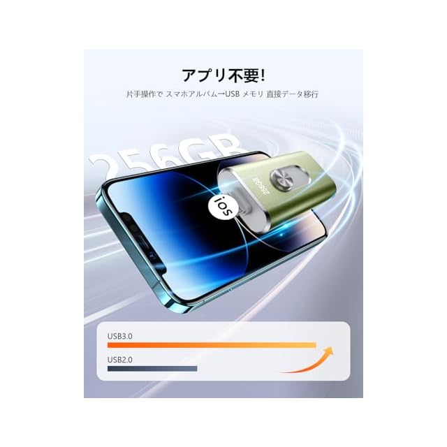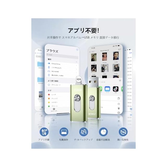 【プリ不要でPhone から直接 USB に写真・動画を移す 】 この Phone 対応 USB メモリは、専用アプリ不要でスマホのアルバムから動画・写真データを直接外付け USB メモリに保存可能!機器が苦手な方でも直結だけで簡単にデータ移行でき、Phone データ保存や外付けメモリとしての使い勝手を追求。USB3.0 規格搭載で高速アクセスを実現し、iOS/Android/Windows/Mac 対応で幅広い環境で活躍します。