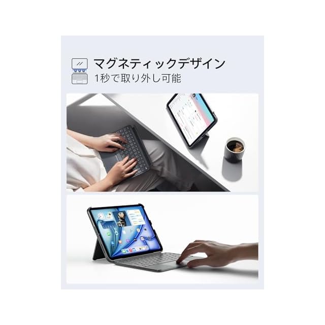 1秒磁石脱着:ipad キーボード付きケースは磁石接続で1秒で簡単に着脱可能。仕事ではキーボードを装着すると「ノートPC」のように変身し、キーボードと画面の角度がよりフィットします;昼休みの動画視聴や会議でのプレゼン時は瞬時に薄型ケースに変身。背面スタンドは横置きでの動画鑑賞から縦置きでの文書閲覧まで、1つのアクセサリーですべてのシーンに対応