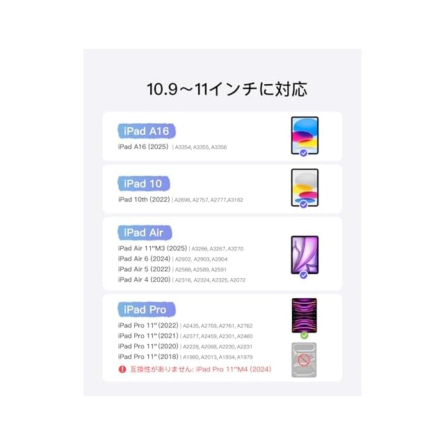 互換性:iPad A16 第11世代/第10世代、iPad Air 11インチ M3 2025/M2 2024、iPad Pro 11インチ第4/3/2/1世代、iPad Air 第5世代/第4世代(10.9インチ)向けに特別に設計されています。iPad Pro 11 第4世代 2022(A2435/A2759/A2761/A2762)、iPad Pro 11 第3世代 2021(A2301/A2377/A2459/A2460)、iPad Pro 11 第2世代 2020(A2228/A2068/A2230/A2231)、iPad Pro 11 第1世代 2018(A1980/A2013/A1934/A1979)と互換性があります