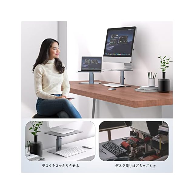 【スペース有効活用】●コの字のモニタースタンドと異なるのは、BoYataモニター台 机上台の魅力は横幅を取らなく、デスクスペースが有効活用できることです。一本支柱のデザインなので、下の段に収納するキーボードの幅を気にする必要がありません。時計や電源タップ、また種々のインターフェイスなども収納できて、テーブルに清潔感を保つことができます。