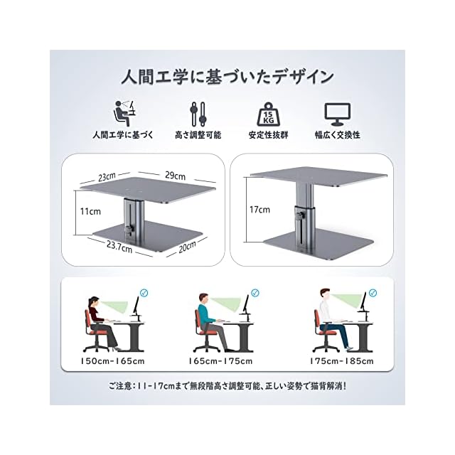 【幅広く互換性】デュアルモニター、PCモニター、パソコン、iMac、ノートPC、スピーカー、ディスプレイなどに幅広く対応可能なモニター台、机上台です。自宅、オフィス、寮やワークスペースへの追加に理想的。●モニタースタンドのサイズ:(天板)長約29cm×幅約23cm、(底板)長約23.7cm×幅約20cm、高さ11cm~17cmまで調節可能。モニター台重量:約2.8kg、安定性抜群。