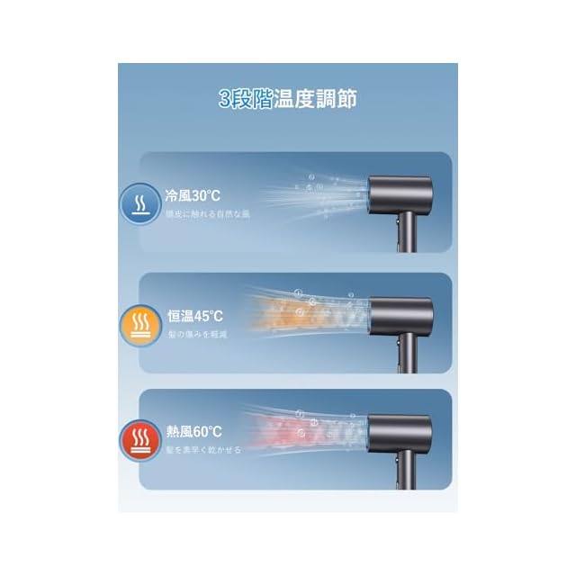 【3段階温度調節&過熱保護機能】30℃~60℃の 3 段階温度調節に対応(含 45℃恒温モード),冷風 / 熱風を自由切り替え。髪と頭皮の過熱を防ぎ、敏感肌やダメージヘアにも優しい設計です。さらに過熱保護機能を搭載:本体温度が危険値の 105℃に達すると自動遮電し、使用安全を最大限保障します。